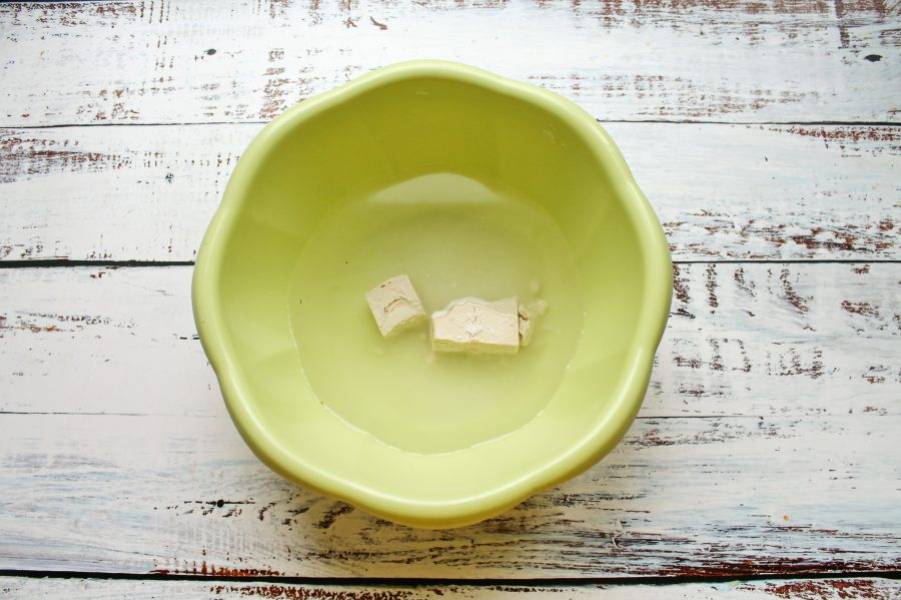 В теплую воду добавьте соль, сахар, дрожжи и перемешайте до однородности.