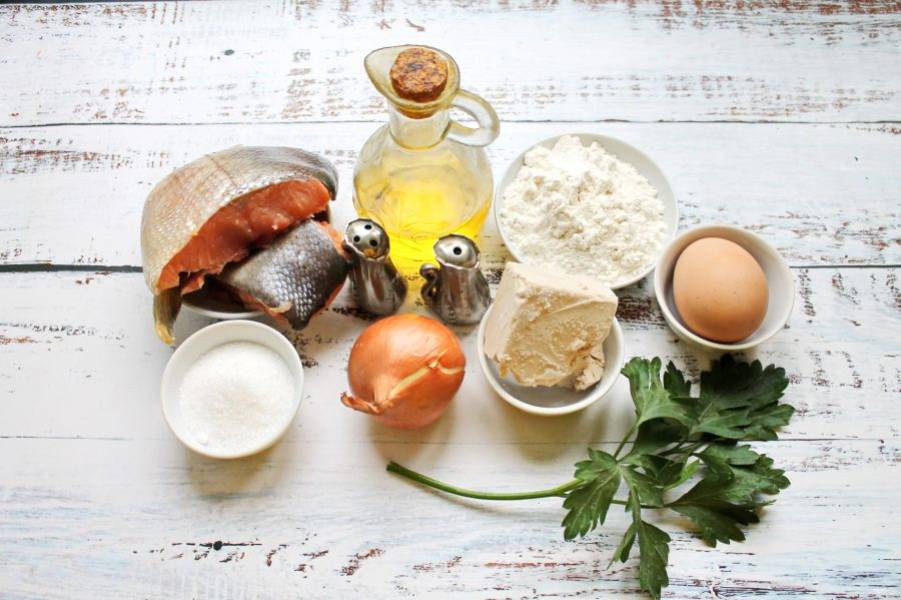 Подготовьте все необходимые ингредиенты для приготовления расстегаев с семгой.