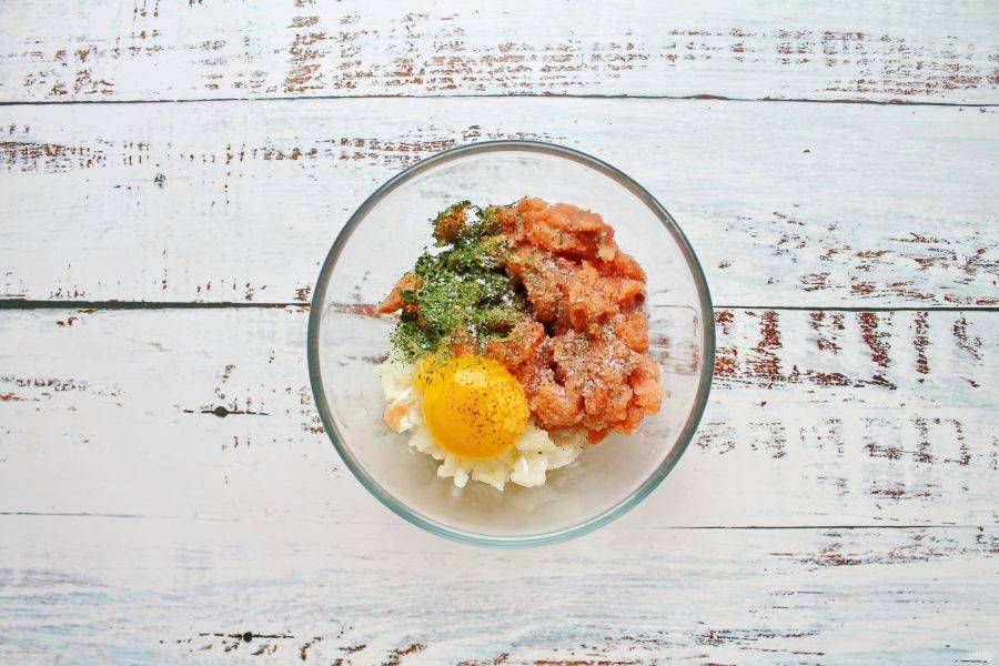 В миску выложите мелко нарезаный репчатый лук, мелко порезанное филе семги, желток и нарезанную зелень. Все посолите, поперчите и перемешайте.