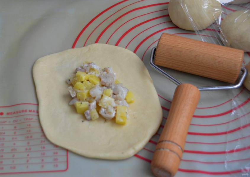 Раскатайте тесто в лепешку, в центр которой выложите начинку.