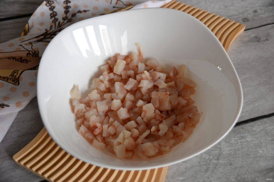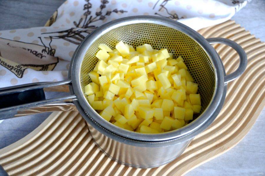 Пока тесто подходит, займитесь приготовлением начинки. Нарежьте картофель мелким кубиком, и отварите в подсоленной воде до полуготовности, можно в сите, как на фото.