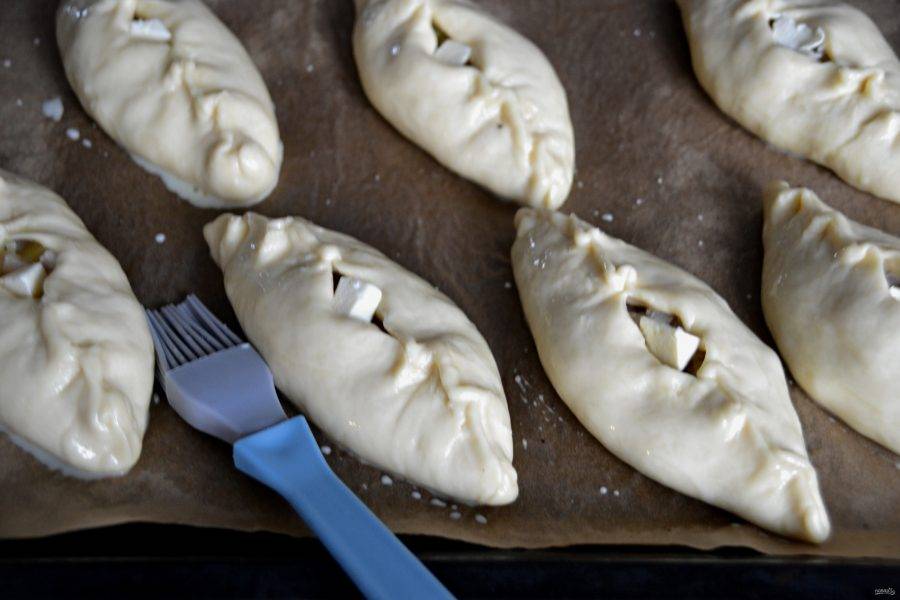 Для смазывания расстегаев перед выпечкой приготовьте смесь из небольшого количества молока и 1 яичного желтка. Смажьте этой смесью расстегаи. По желанию можно положить внутрь каждого расстегая небольшой кусочек сливочного масла через оставленное отверстие. Это придаст начинке нежный сливочный вкус.