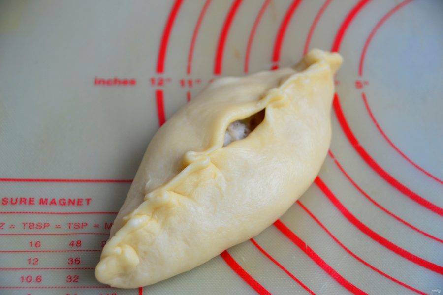 Защипните пирожок с двух сторон, оставив в центре небольшое отверстие. Защипывайте особенно тщательно, чтобы при выпекании он не раскрылся.