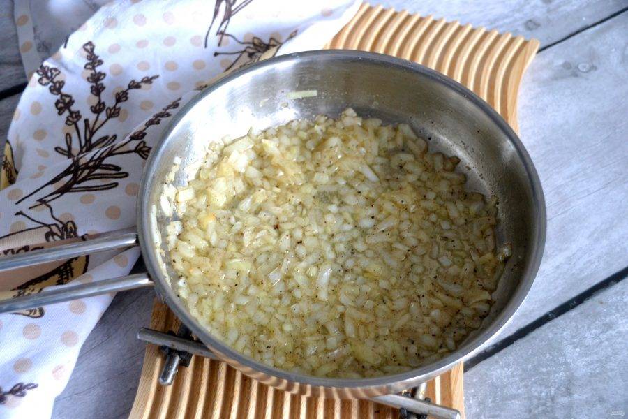 Мелко нарежьте лук и обжарьте на смеси растительного и сливочного масел, посолите, поперчите по вкусу.