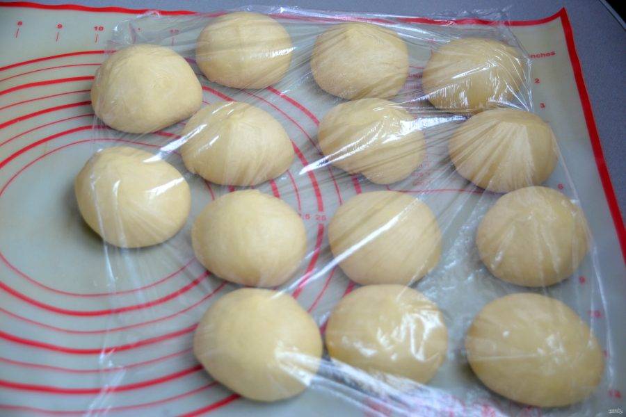 Готовое тесто должно увеличиться в объеме в 1,5-2 раза. Разделите тесто на 14 равных частей весом около 95 граммов. Подкатайте каждую часть в шар, накройте пищевой пленкой, дайте тесту отдохнуть 15-20 минут.