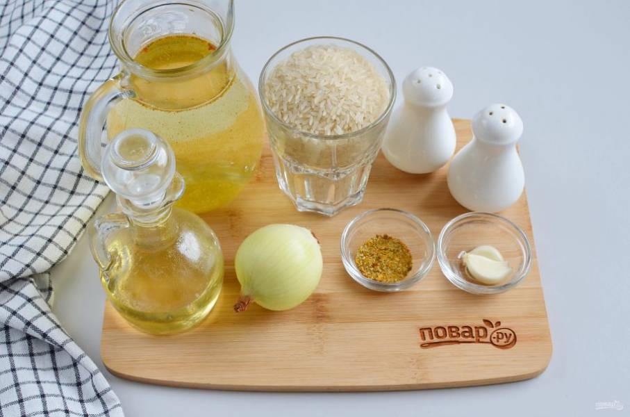Подготовьте ингредиенты. Рис хорошо промойте в нескольких водах, хорошо слейте влагу. Очистите лук, чеснок и мелко порубите ножом.