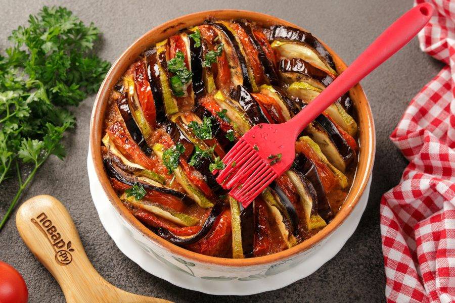 Смажьте рататуй приготовленным соусом.