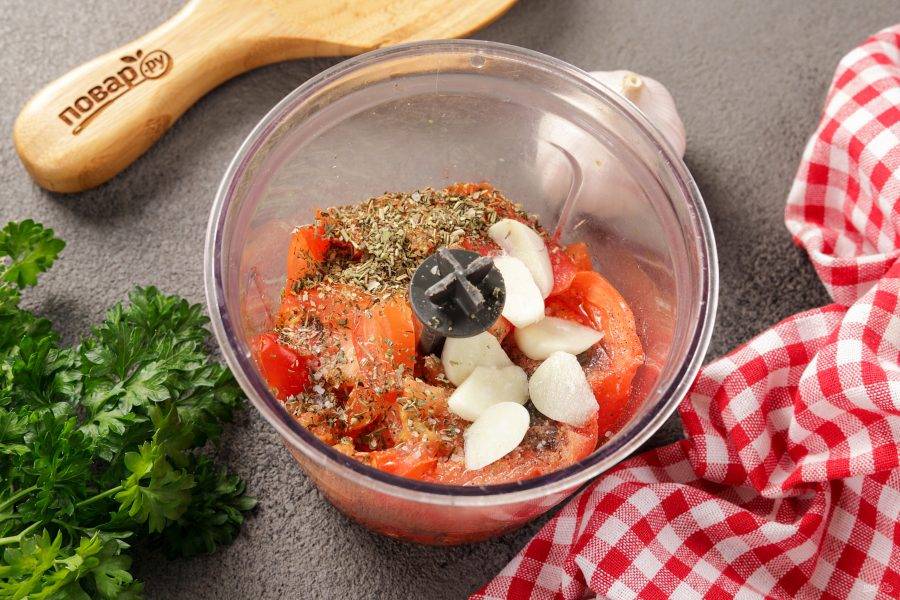 Томатный соус можно взять готовый или приготовить самостоятельно. Помидоры помойте и обсушите, нарежьте на 2-4 части, переложите в измельчитель, добавьте чеснок, специи и оливковое масло.