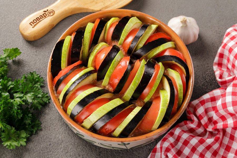 Наполните форму с соусом нарезанными овощами, чередуя их между собой. Овощи выкладывайте максимально близко друг к другу, так как в процессе выпекания они уменьшатся.