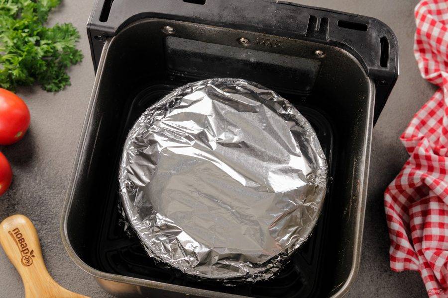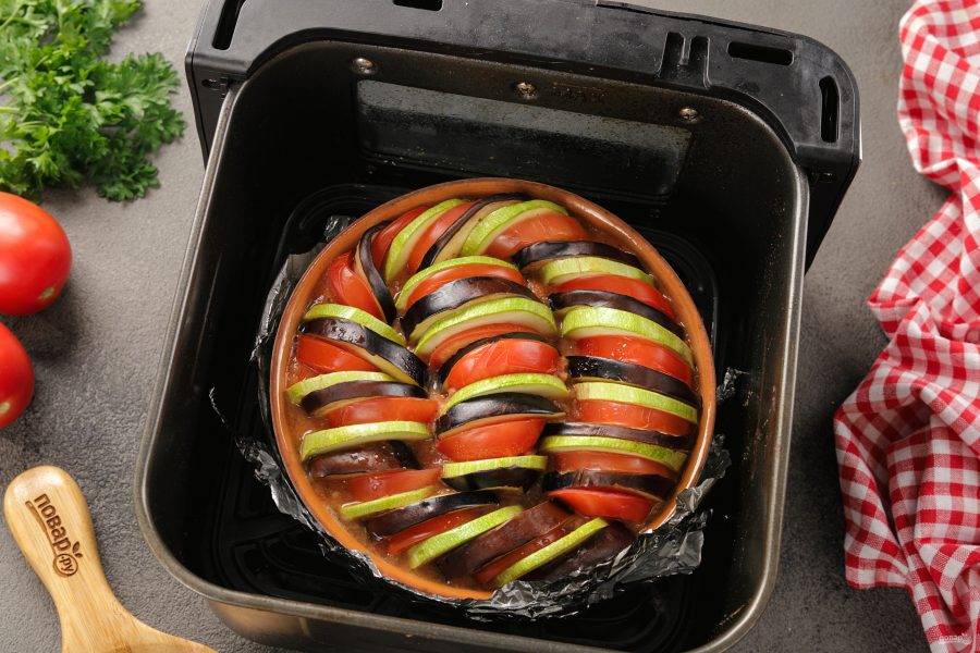 Форму с овощами установите в аэрогриль. Накройте ее фольгой. Установите время приготовления — 30 минут при 200 градусах. Готовьте рататуй в аэрогриле до сигнала.