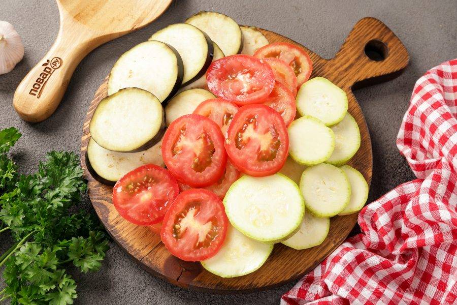 Кабачок, баклажан и помидоры нарежьте на тонкие кружочки.