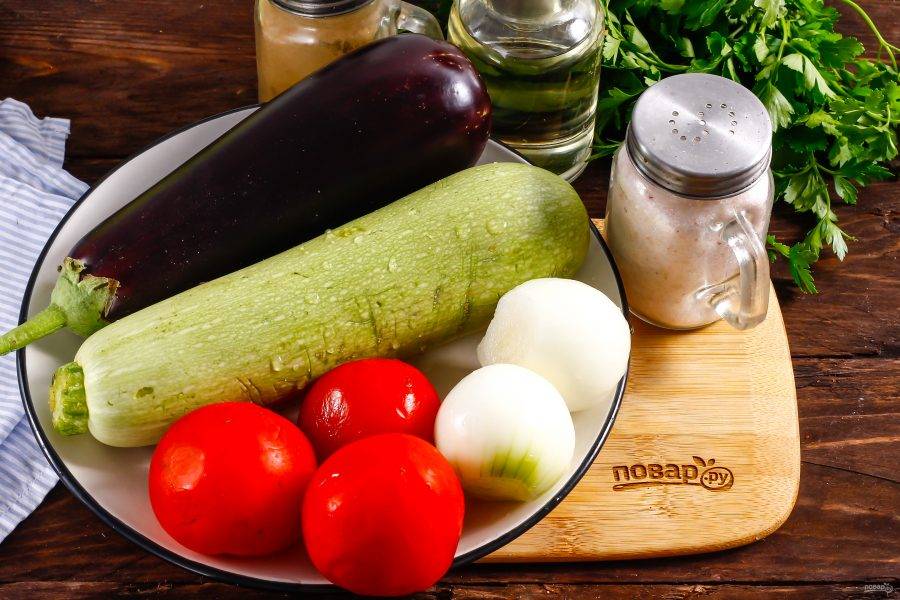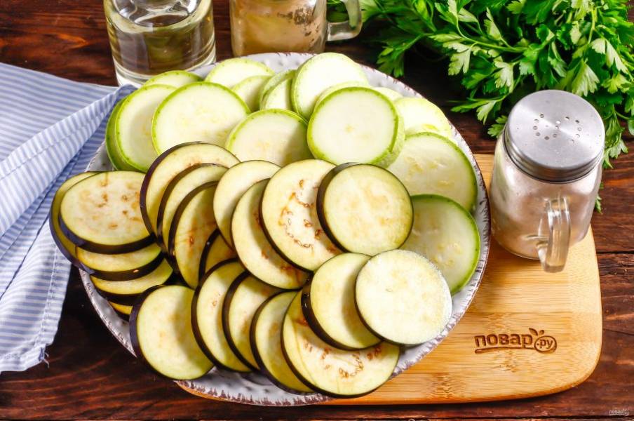 В это время промойте баклажан и кабачок в воде, срежьте хвостики и нарежьте их кружочками не толще 1 см., иначе они долго будут готовиться.