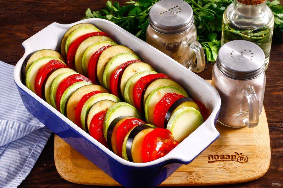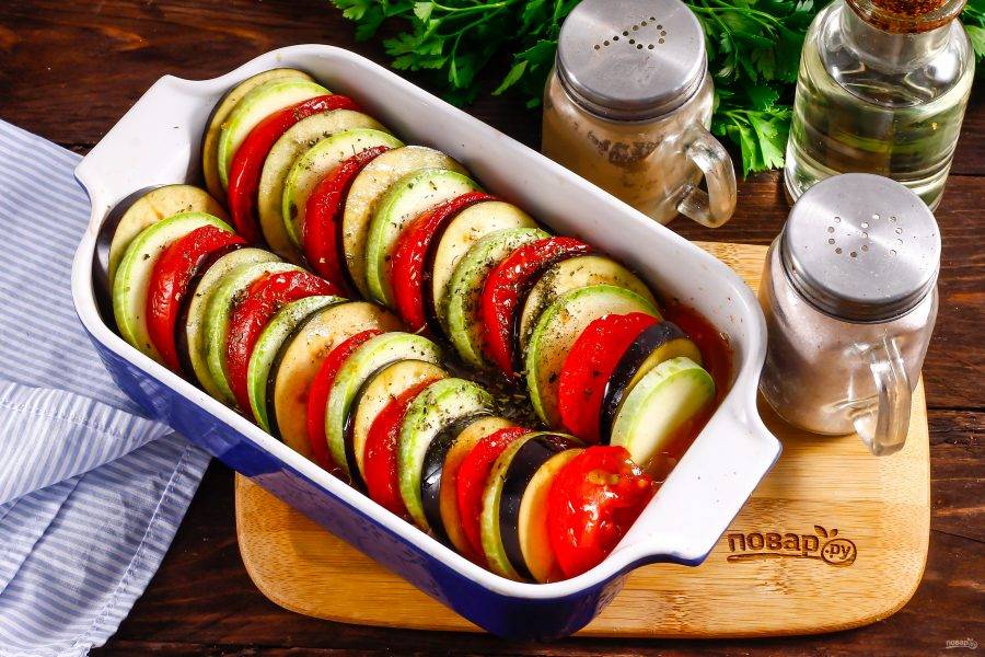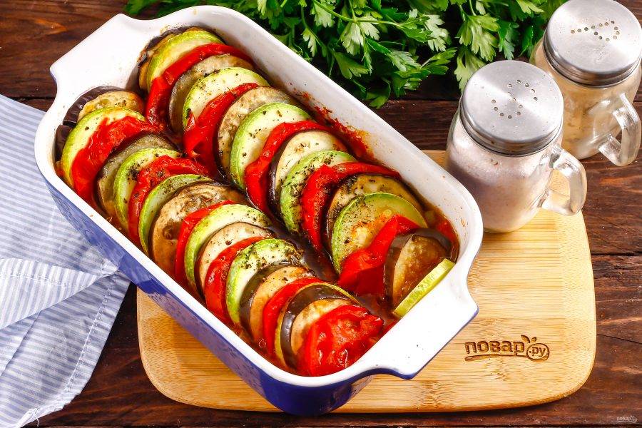 Извлеките готовый рататуй из микроволновки, проколите в середине и по краям ломтики кабачков, проверяя их.