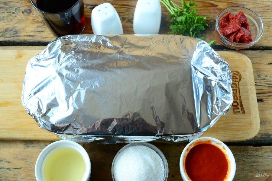 Добавьте в форму 150 мл воды, накройте форму фольгой и отправьте в духовку на 1 час (температура — 150 градусов).