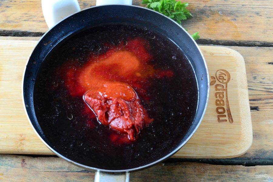 Также добавьте томатный соус и томатную пасту, хорошенько перемешайте и варите на медленном огне 15 минут.