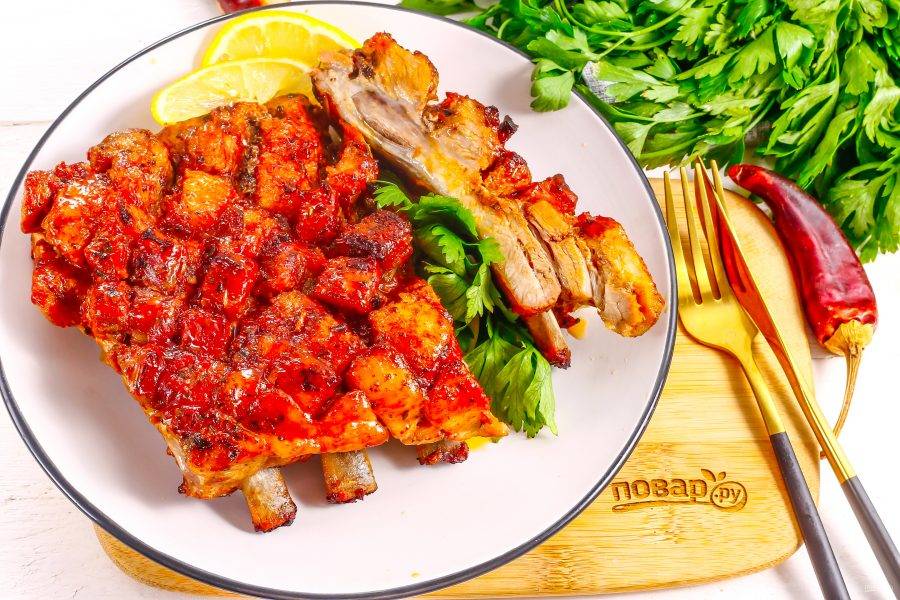 Выложите горячие ребрышки на тарелку, нарежьте порционно и украсьте свежей зеленью при подаче.