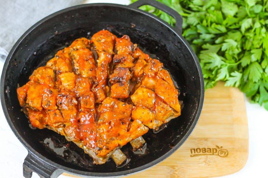 Затем фольгу удалите и обмажьте ребрышки оставшейся частью соуса. Запеките еще 15-20 минут до румяной корочки.