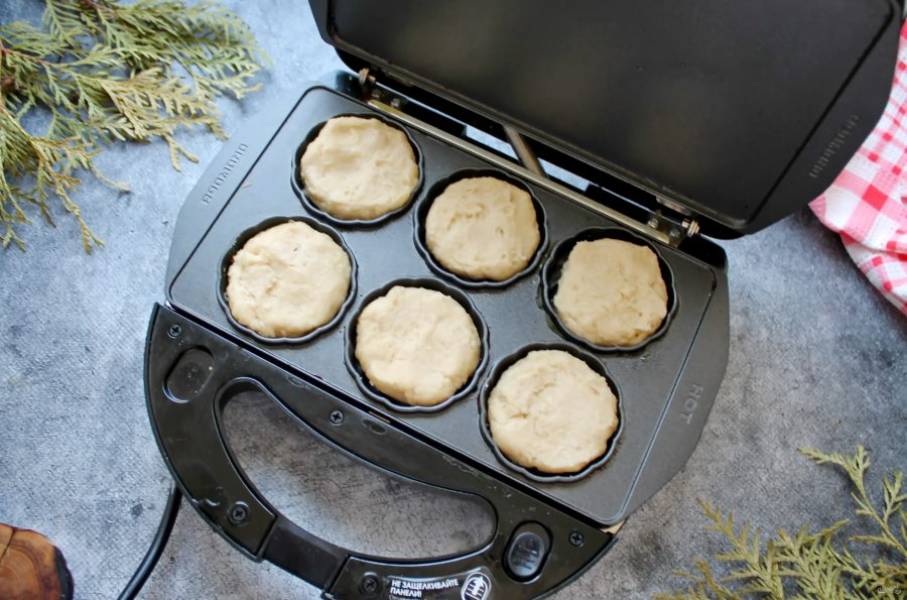 Установите панели в мультипекарь, закройте и разогрейте. Сделайте шарики примерно по 25-30 грамм и выложите в ячейки, разровняйте.