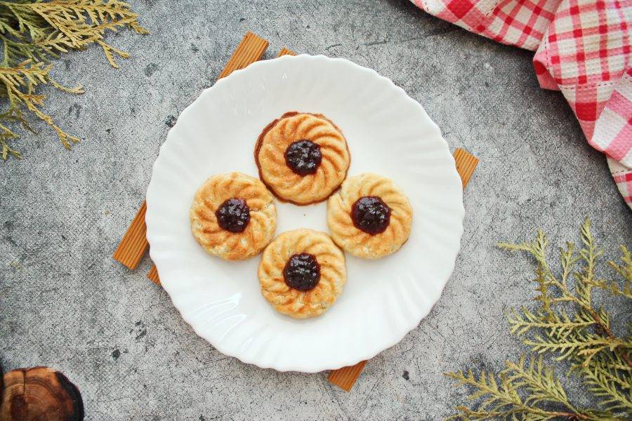 После того как печенье остынет, заполните отверстия джемом и подавайте к столу.