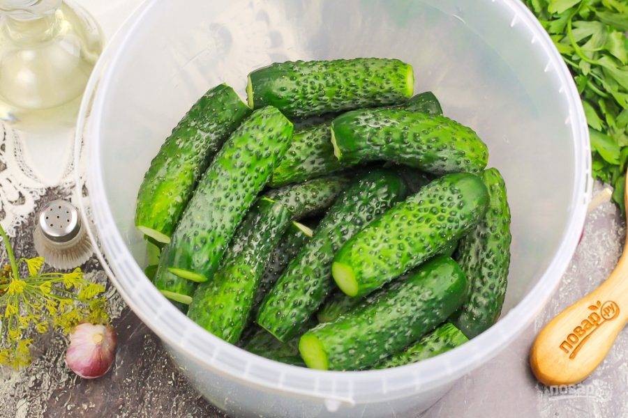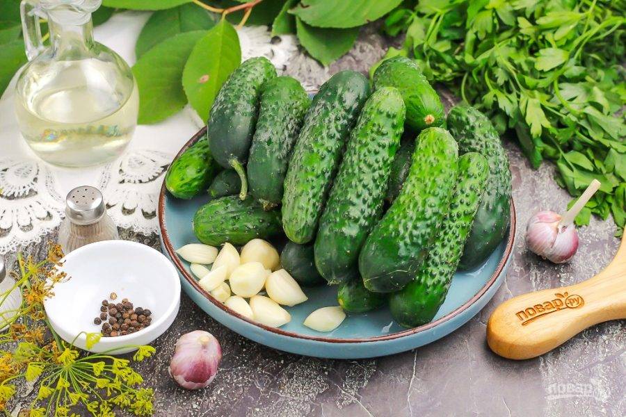Подготовьте указанные продукты. Очистите зубчики чеснока от шелухи, промойте вместе с огурцами в воде. Заранее вскипятите и остудите воду для рассола. Обычная из-под крана не подойдет.