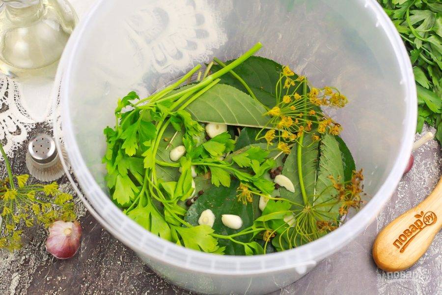 Промойте петрушку и зонтики укропа, выложите на листья вишни. В этот момент можно добавить и остальные пряности, приправы.