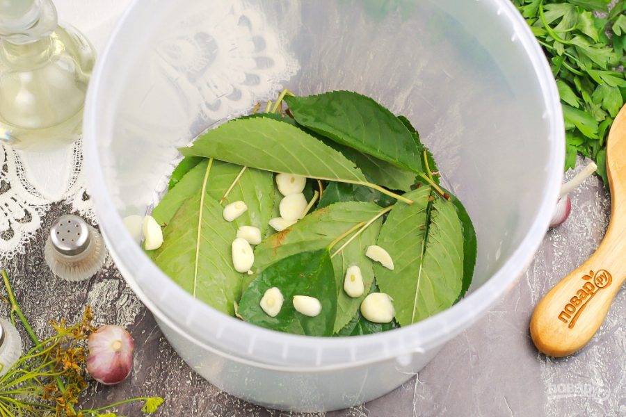 Переберите и промойте листья вишни, выложите их на дно емкости для пищевых продуктов или стеклянной банки. Нарежьте зубчики чеснока слайсами и всыпьте туда же.