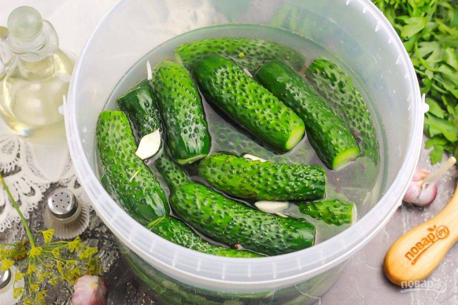 Выложите огурчики в емкость, желательно без пустот, как можно плотнее. В любом случае вы будете через 3-4 дня перемешивать их, поэтому это не столь критично.
