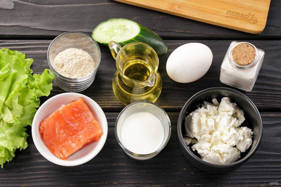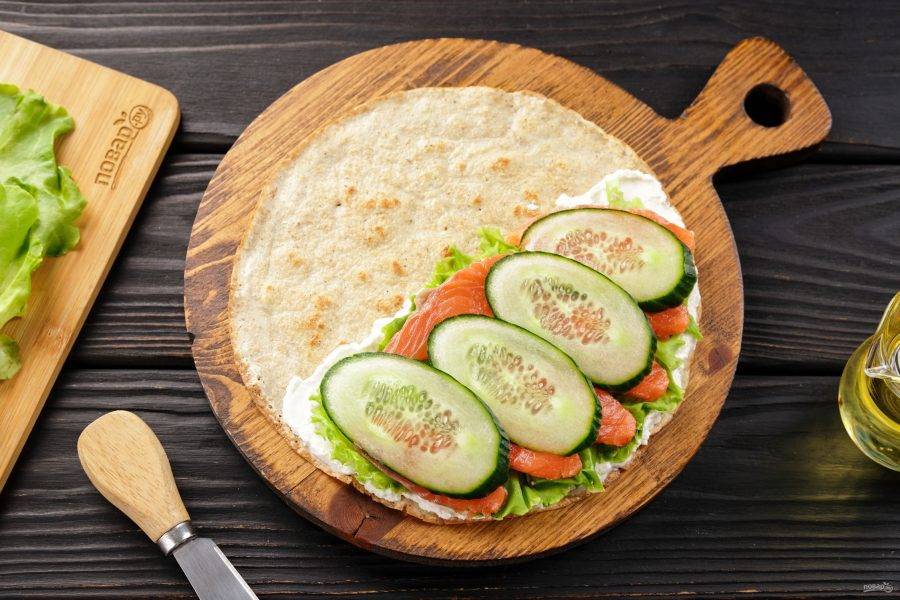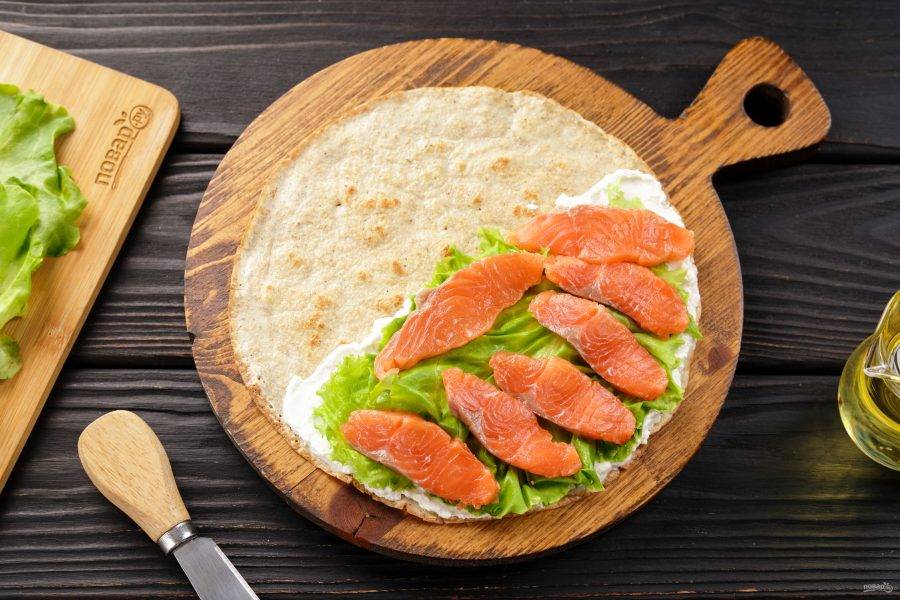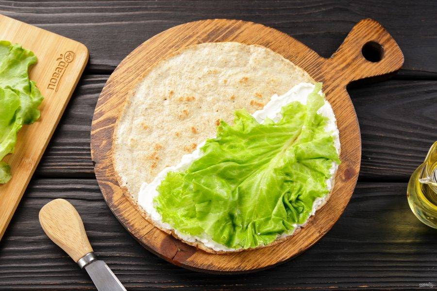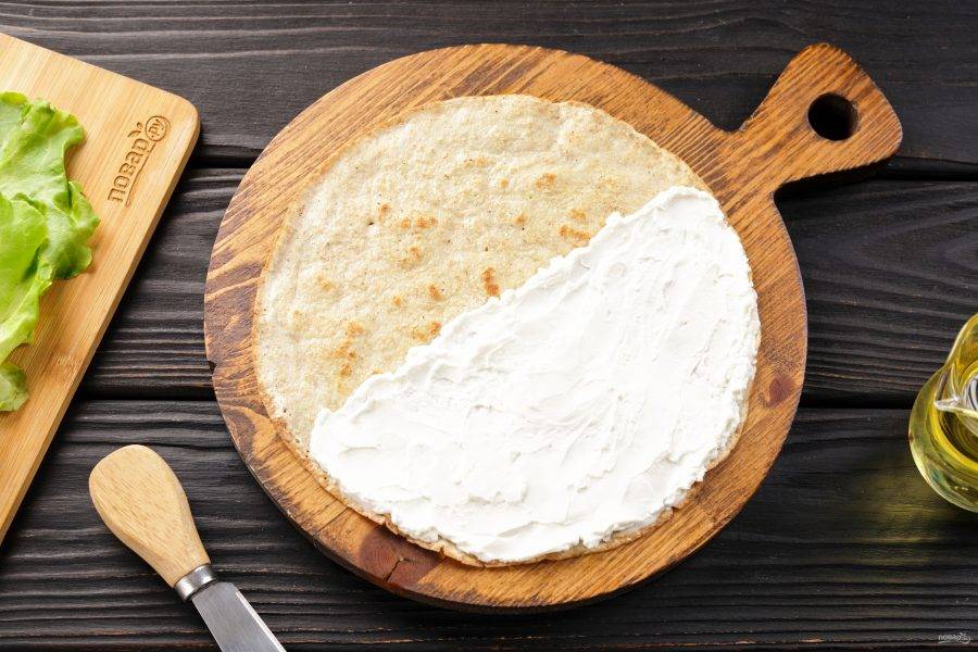 Намажьте творожный сыр на одну половину овсяного блинчика.