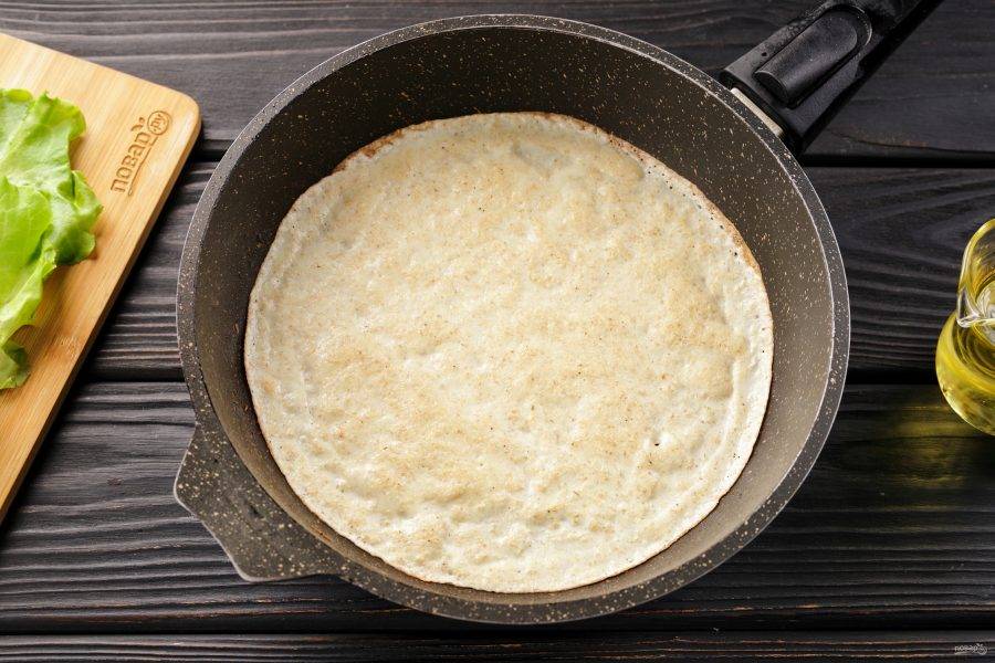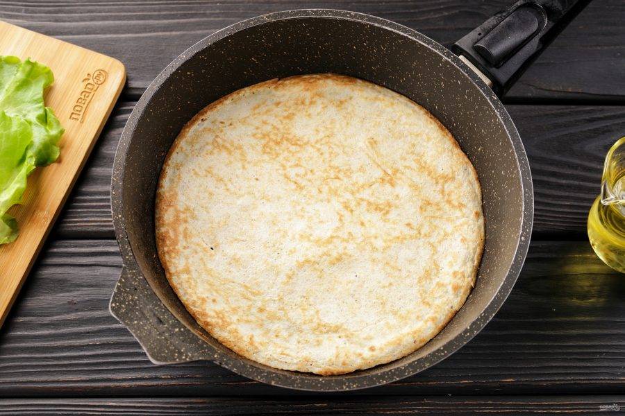 Разогрейте сковороду и смажьте маслом. Вылейте тесто, равномерно распределив его по всей сковороде. В зависимости от диаметра сковороды можно испечь один большой блин потолще или два небольших. У меня сковорода 18 см., получается два тонких блинчика.