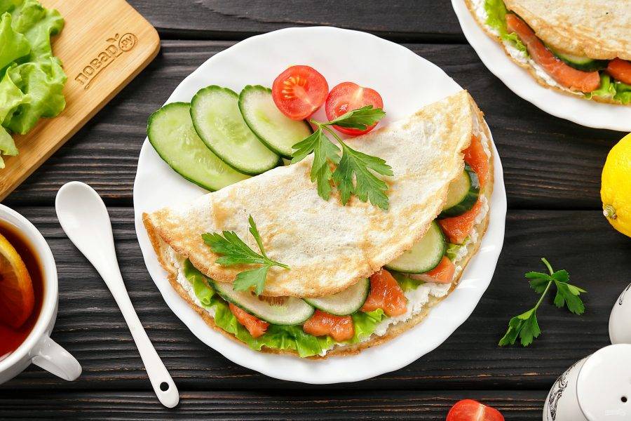 Полезный завтрак готов. Вы можете сделать одну начинку для всех блинчиков или положить разные добавки в каждый блин. Приятного аппетита!