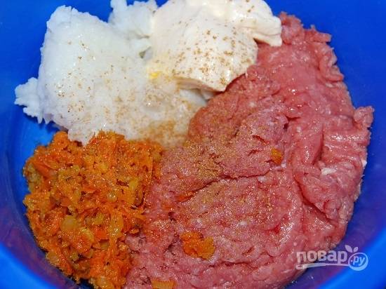 Выкладываем в миску фарш — для тефтелей можно брать любой, у меня индюшачий. Добавляем отваренный остывший рис, обжаренные лук и морковь, майонез, половину соли и перца. Можно добавить травки или любимые специи. Тщательно перемешаем.