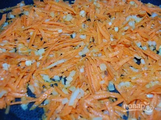 Очистим лук и морковь. Морковь натираем на терке, лук нарезаем мелкими кубиками. Обжариваем на растительном масле до полуготовности.