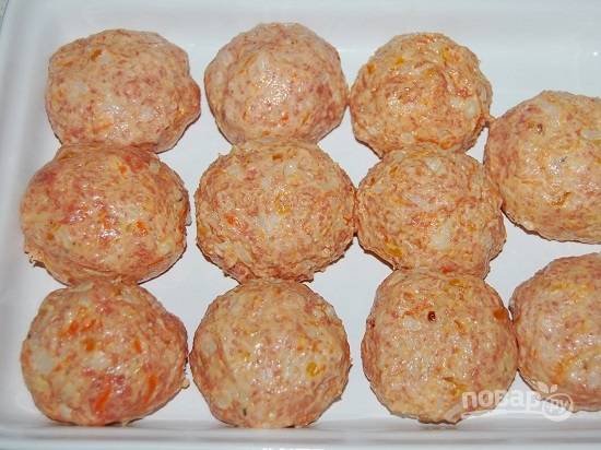 Формируем из получившегося фарша тефтели и выкладываем их в форму для запекания.