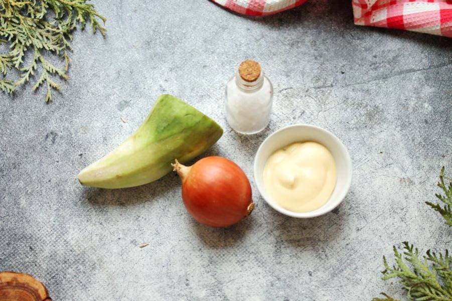 Подготовьте все необходимые ингредиенты для приготовления салата из редьки с майонезом. Редьку и репчатый лук почистите и сполосните.