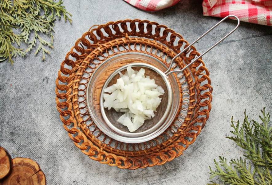 Репчатый лук порежьте тонкими перышками, залейте горячей водой и дайте постоять 5 минут. Ошпаренный лук откиньте на сито и дайте воде стечь.
