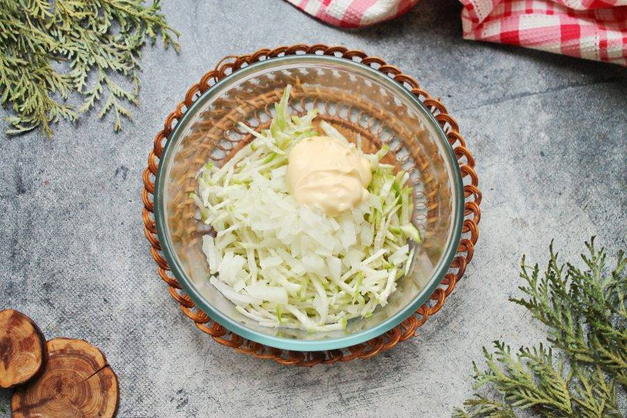 В салатнике соедините редьку, репчатый лук и заправьте майонезом. Салат посолите, перемешайте и подавайте к столу.