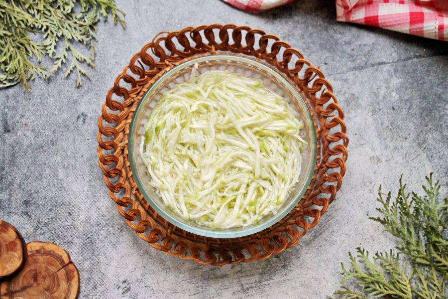 Редьку натрите на терке для корейской моркови или нарежьте тонкой соломкой. Если редька плотная, можно натереть ее на крупной терке. Редьку выложите в миску, залейте холодной водой на 10-15 минут, после чего откиньте на сито и дайте воде полностью стечь.