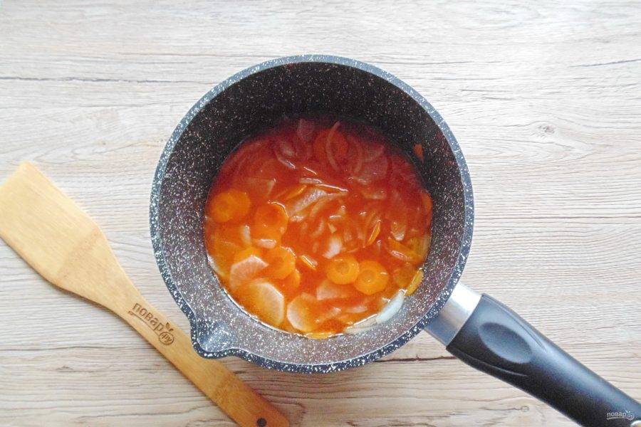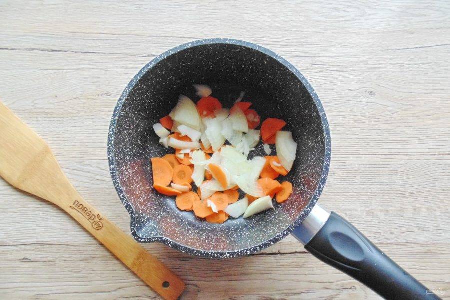 Лук и морковь очистите, помойте и нарежьте произвольно. Выложите в кастрюлю с толстым дном.