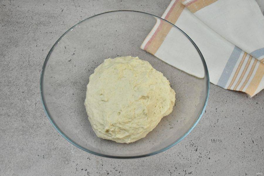 Готовое тесто переложите в миску, накройте и оставьте на 5 часов при комнатной температуре. Каждый час проводите обминку теста.
