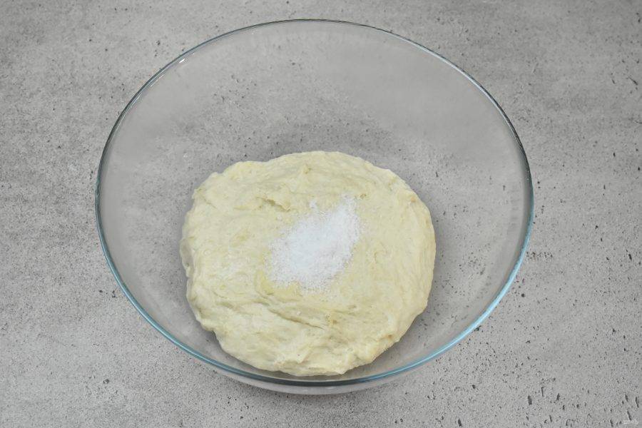 На данном этапе добавьте в тесто соль и проведите окончательный замес теста до средней степени развития клейковины. Тесто замешивайте по принципу растянули и сложили. На данном этапе тесто не должно перегреваться.
