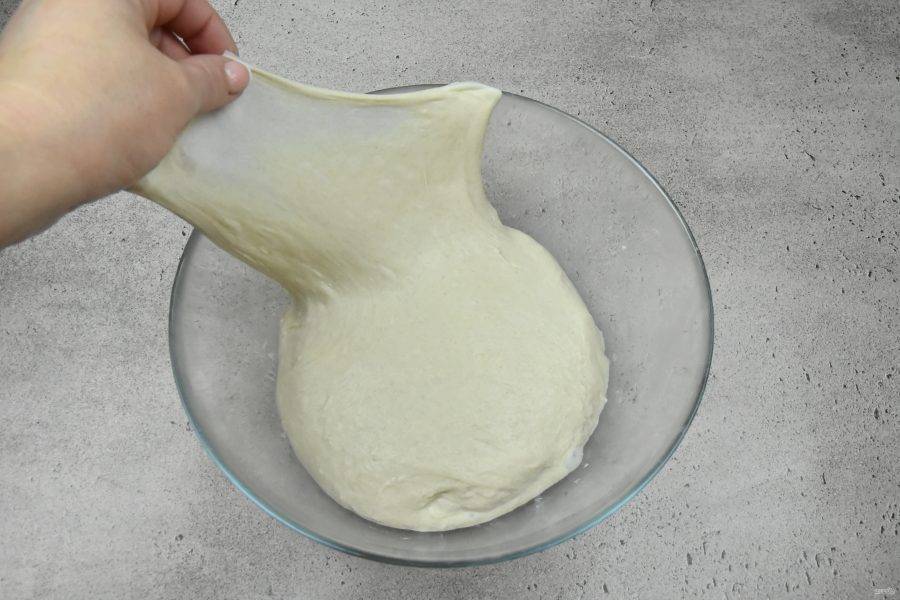 Готовое тесто не липнет к рукам и поверхности, гладкое и слегка блестящее. Оно хорошо растягивается и не рвется.