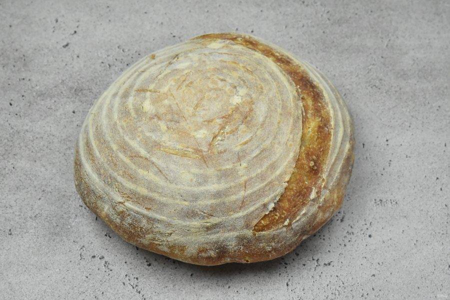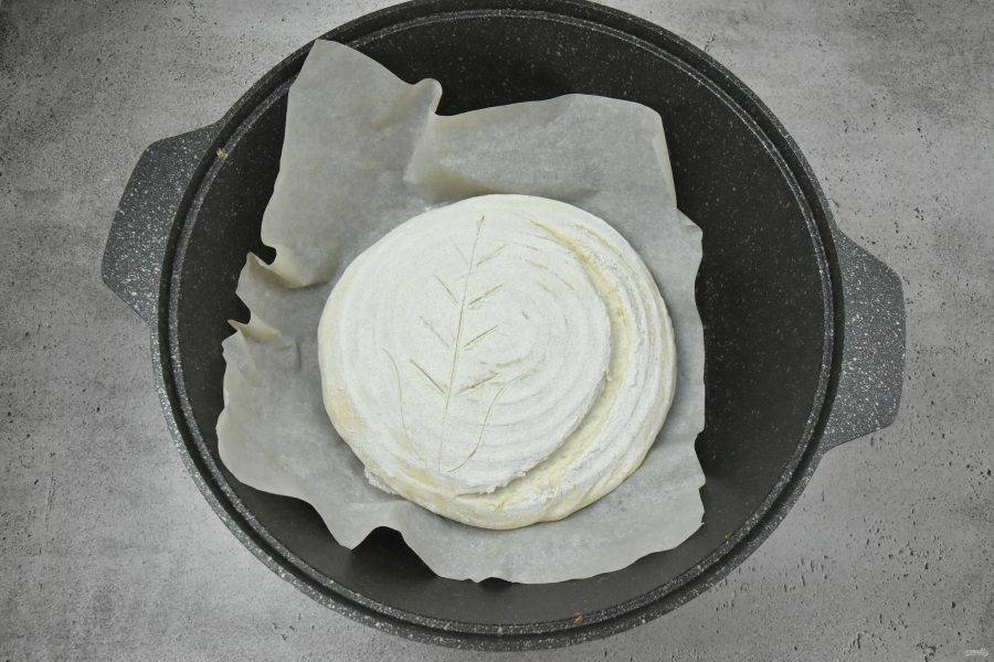 Духовку разогрейте до 250 градусов. Разогрейте форму для выпекания. Переложите хлеб в форму вместе с пергаментом. Выпекайте хлеб 10 минут с паром. Для красивой формы, и румяной хрустящей корки очень важно увлажнение хлеба в первые 10-15 минут выпечки. Для этого достаточно поставить на низ духовки сковороду с кипятком. Другой вариант получения пара, накрыть хлеб колпаком. В этом случае подойдет глубокая жаровня с крышкой. Через 10 минут необходимо снять крышку или удалить сковороду с кипятком и продолжить выпекать хлеб еще 20-25 минут.