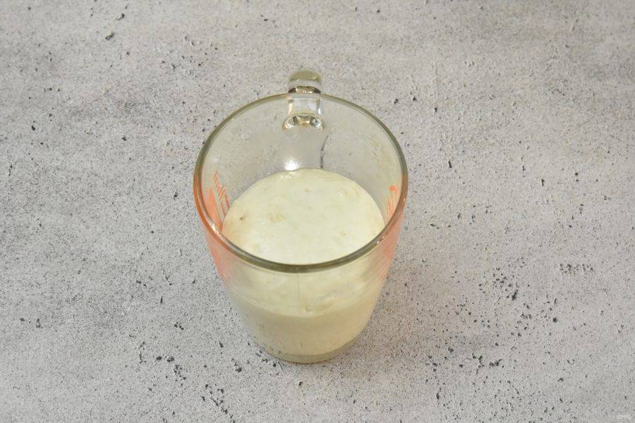 Заранее приготовьте опару на закваске. Соедините в емкости 20 грамм закваски, 40 мл. воды и 40 грамм пшеничной муки. Перемешайте, накройте емкость крышкой или пленкой и оставьте при комнатной температуре на 6-8 часов. Это удобно сделать с вечера и утром стартер для приготовления теста будет готов. На пике активности опара увеличится в размере в 2,5-3 раза.