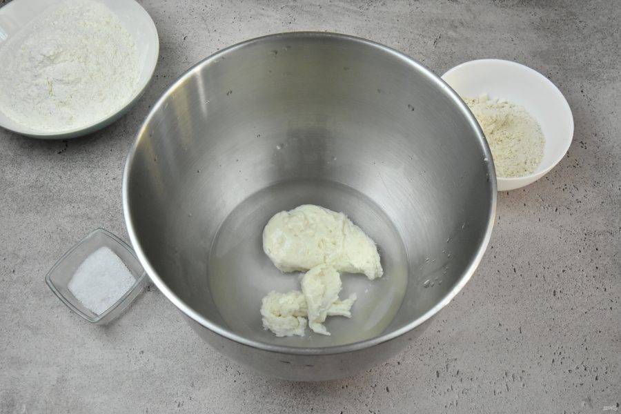 Для приготовления теста влейте в емкость прохладную воду, переложите в нее всю опару из закваски, перемешайте.