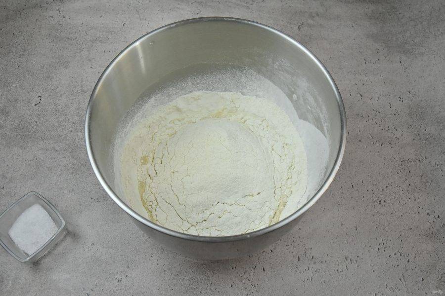 Пшеничную муку высшего или 1 сорта соедините с цельнозерновой и просейте через сито. Пересыпьте смесь в жидкую составляющую теста.