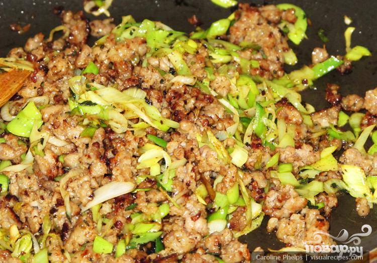 Убрать мясо из сковороды. Добавить 2 столовые ложки оливкового масла и шалфей. Жарить в течении 1 минуты. Добавить кайенский перец и лук-порей. Готовить еще 2-3 минуты. Вернуть мясо в сковороду. Выключить огонь.