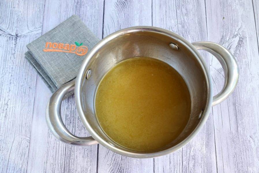 Желатин замочите в холодной воде (50 мл) на 15 минут. Соедините с процеженным бульоном, подогрейте до растворения желатина на медленном огне.