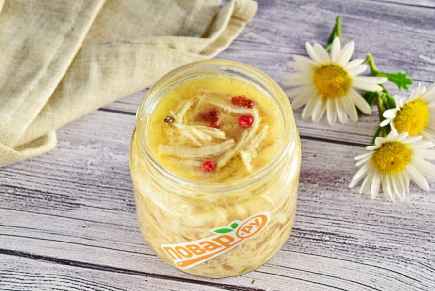 Мясо сложите в банки, поливая желейным бульоном. Добавьте розовый перец. Поставьте в холодильник до застывания на полчаса. Угощайтесь!