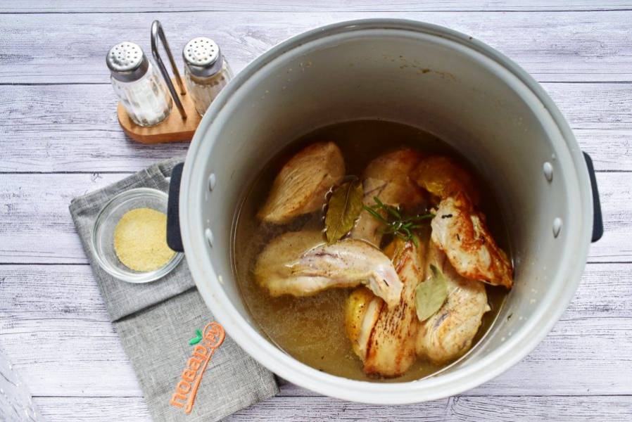 Выложите мясо в чашу мультиварки, добавьте белое вино, черный перец молотый, лавровый лист, розмарин. Долейте воды, так чтобы она покрыла мясо. Готовьте в течение 2 часов в режиме "Тушение". Бульон слейте, процедите, остудите до теплого состояния.