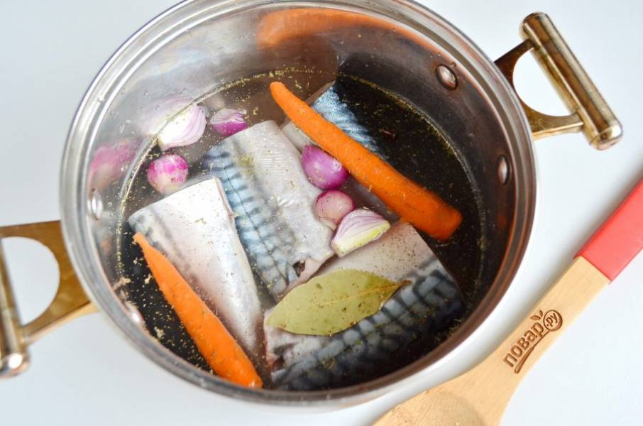 2. Положите рыбу в кастрюлю, туда же отправьте лук и морковь, лавровый лист, щепотку тимьяна, белое вино. Посолите, поперчите. Доведите до кипения, накройте крышкой, снимите с огня и оставьте на 15 минут.